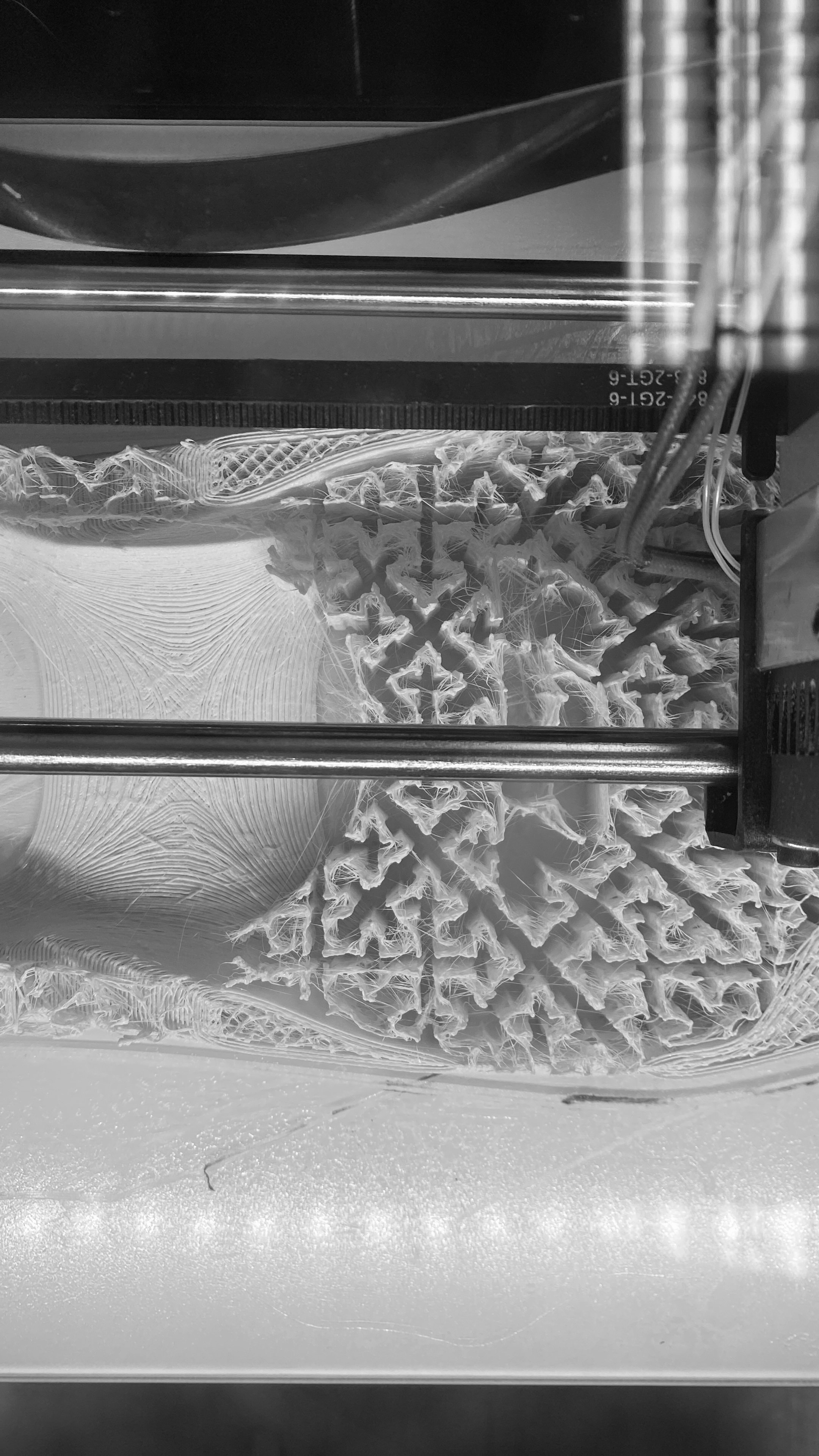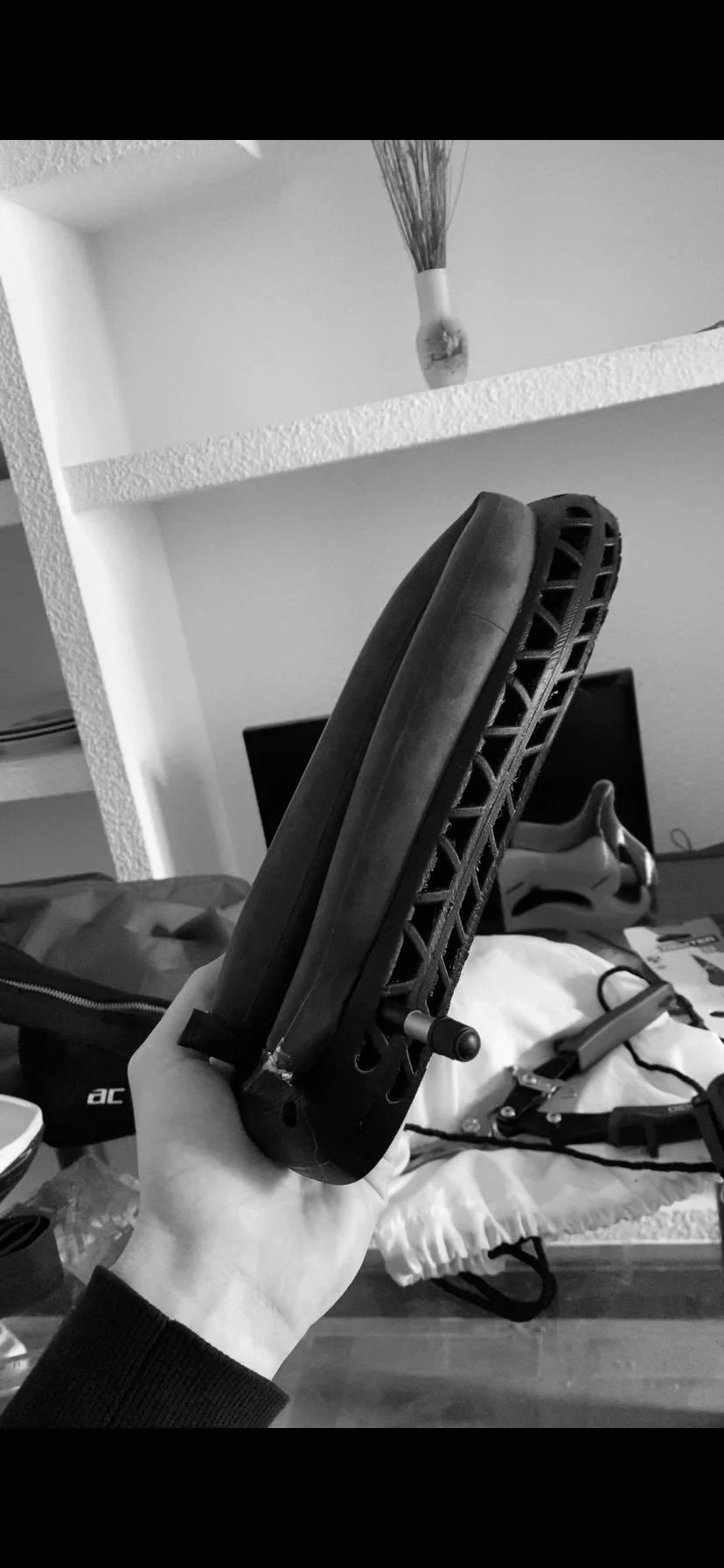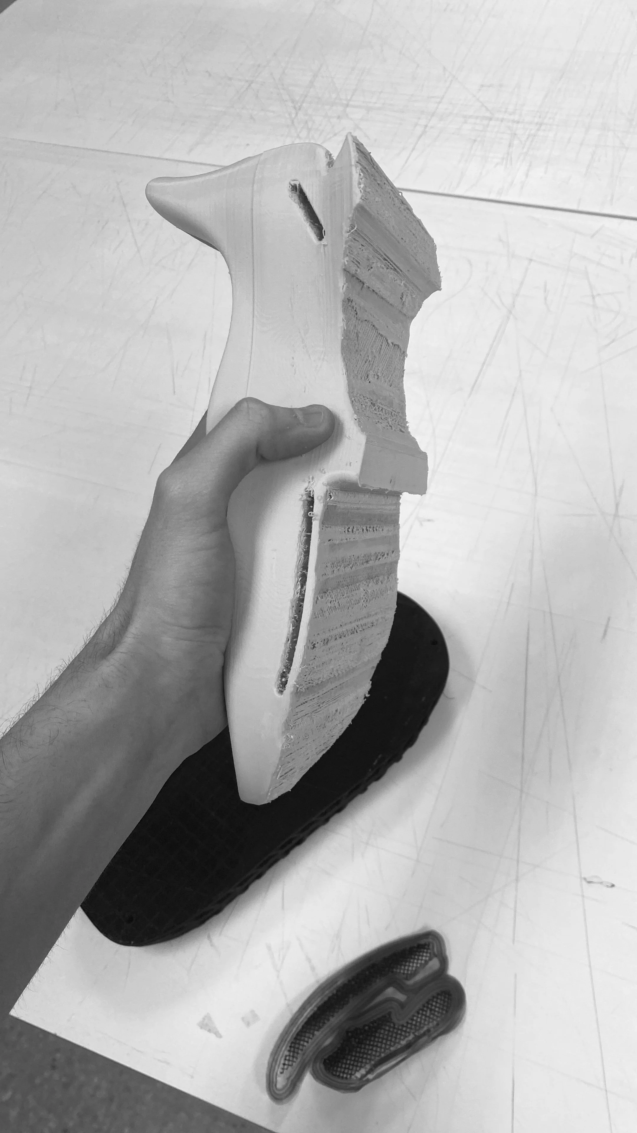 Finalmente, la zapatilla definitiva terminó modelándose mediante herramientas 3D e imprimiéndose por partes con filamento flexible Recreus, que permitía simular fielmente el caucho de una suela de zapatilla tradicional.