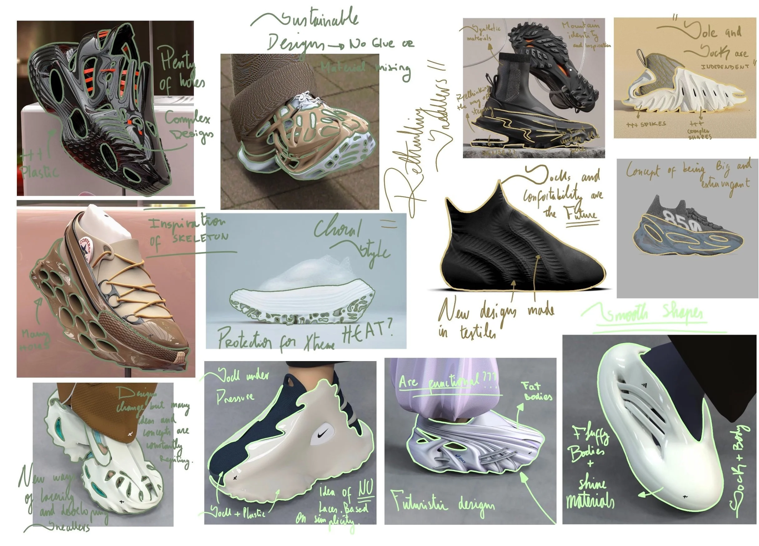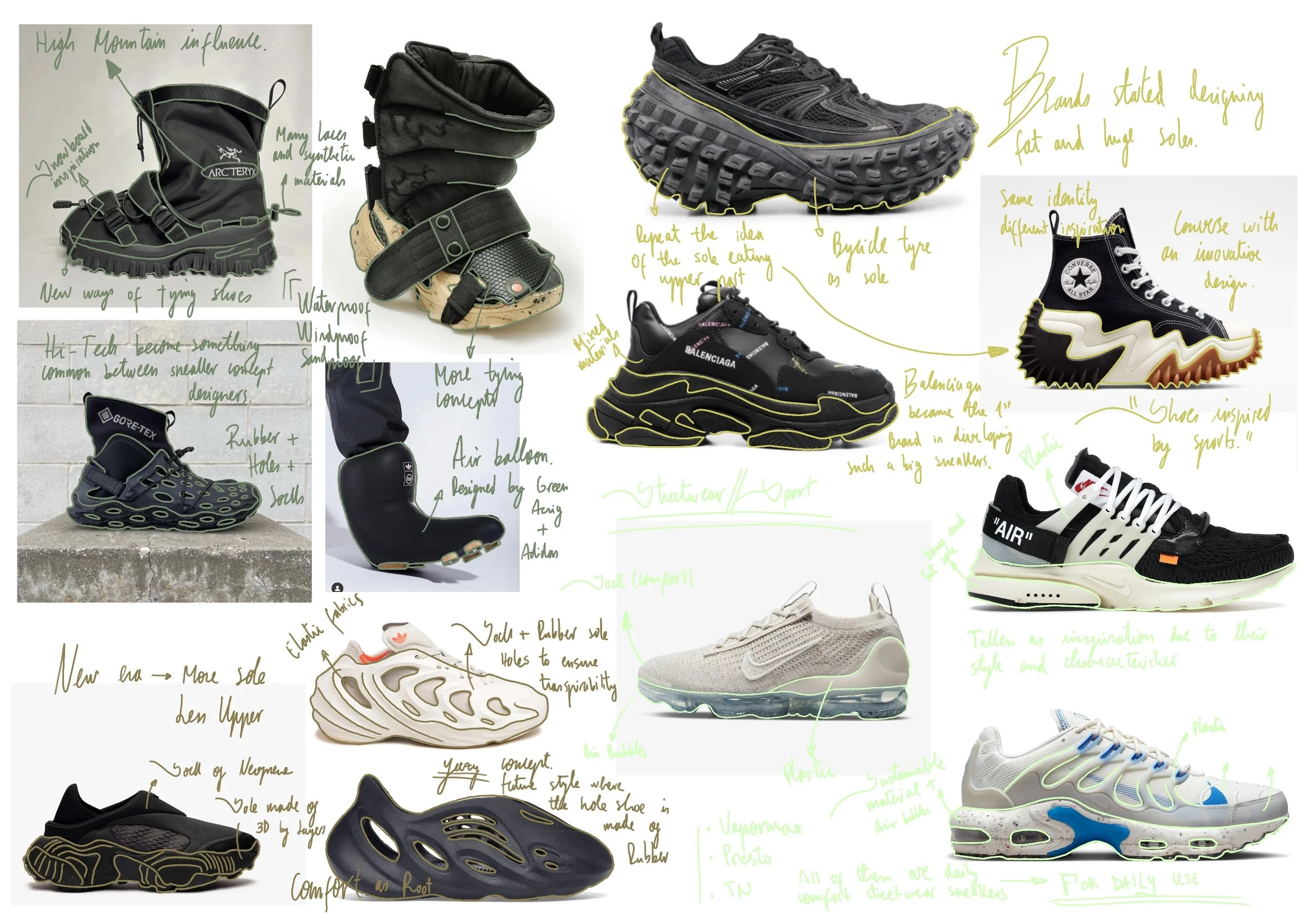 El PROCESO CREATIVO para el desarrollo de las zapatillas se ha basado principalmente en la investigación de materiales y escenarios futuros, así como en el streetwear como punto de partida del proyecto.
